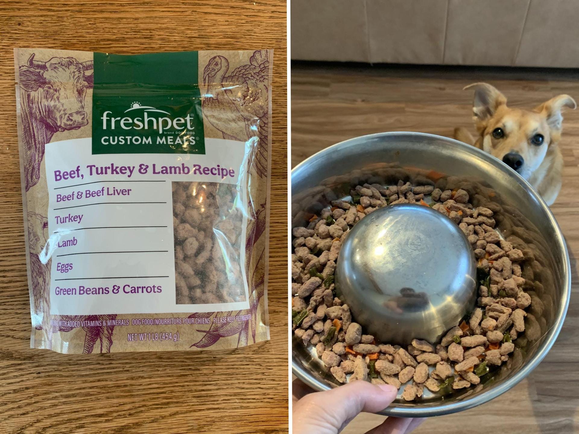 A bag of Freshpet Custom Meals dog food labeled "Beef, Turkey & Lamb Recipe" is on the left, and on the right, a dog is looking up<br /><a href=Read the rest at Business Insider